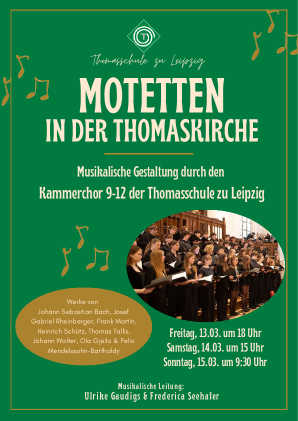 Sie sind herzlich zum Motettenwochenende des Kammerchores vom 13.03. bis 15.03.2026 in der Thomaskirche eingeladen. Alle Informationen zu den jeweilgen Tagen finden Sie auf dem Plakat.
