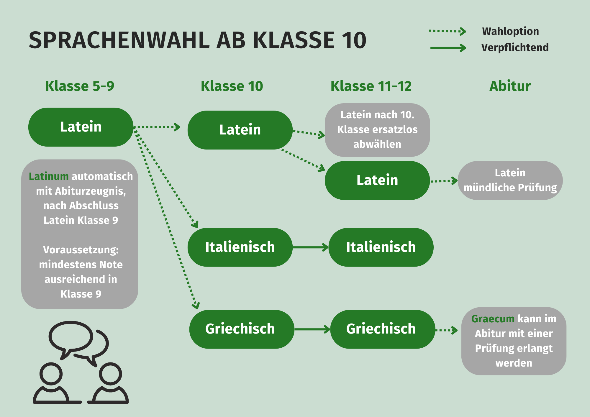 Entsprechend der Schulordnung für das Gymnasium in Sachsen können alle Schülerinnen und Schüler, die in der Klasse 5 mit dem Lateinunterricht begonnen haben, in der Klassenstufe 9 entscheiden, ob sie mit dem Beginn der Jahrgangsstufe 10 weiter am Lateinunterricht teilnehmen oder anstelle dessen eine andere Fremdsprache, die in der Schule angeboten wird, erlernen.