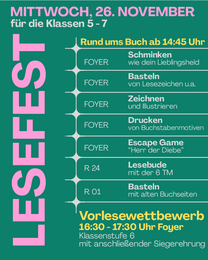 Am Mittwoch dem 26.11.2025 findet ein weiteres Mal das Lesefest statt.